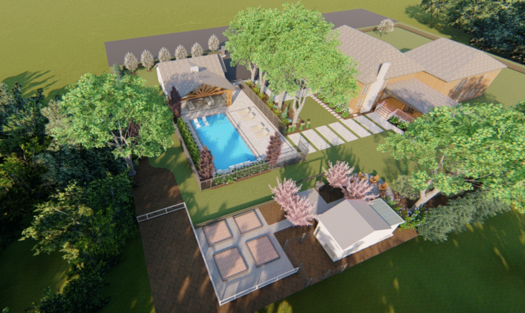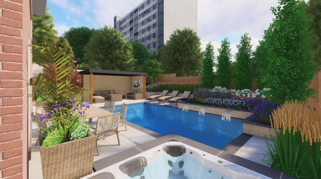 Explore our Oakville landscape design project on Chamberlain Ln. Featuring 3D planning, custom pool, patios, premium hardscapes, and curated plantings. A timeless design by Leo Landscape Studio.