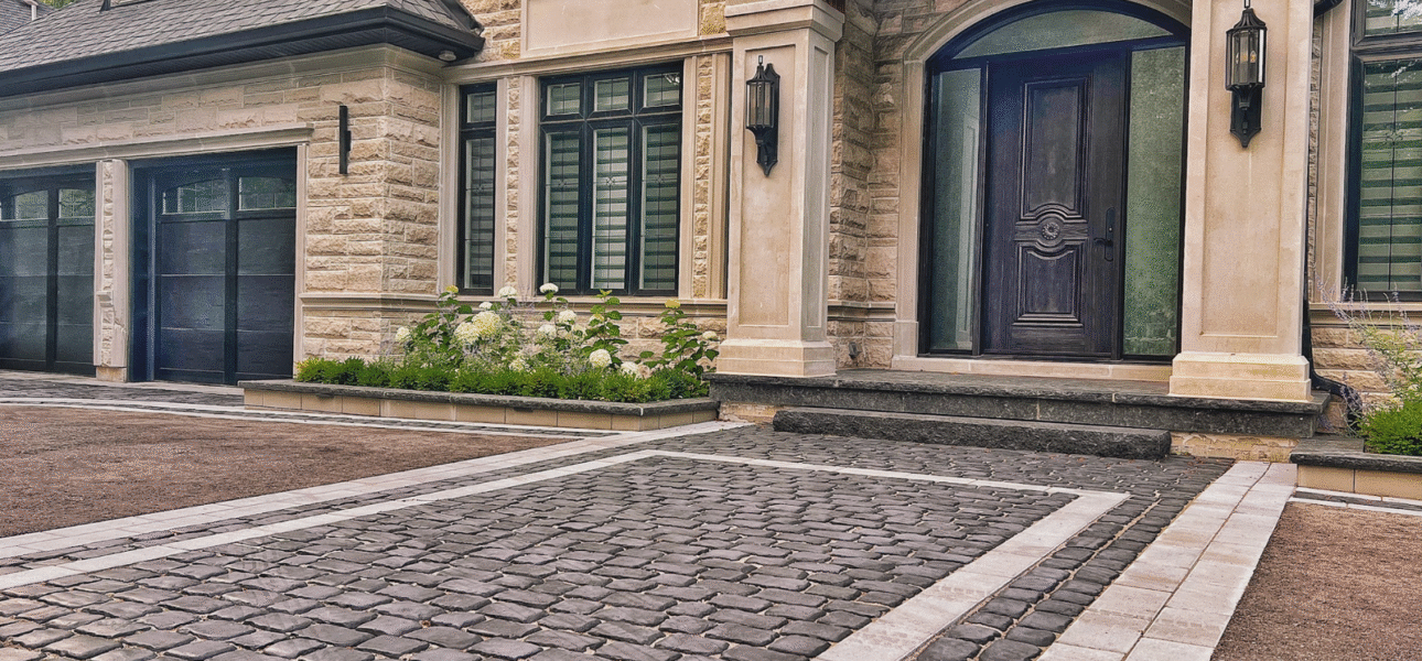Distinct Unilock patterns enhancing structure and curb appeal.
