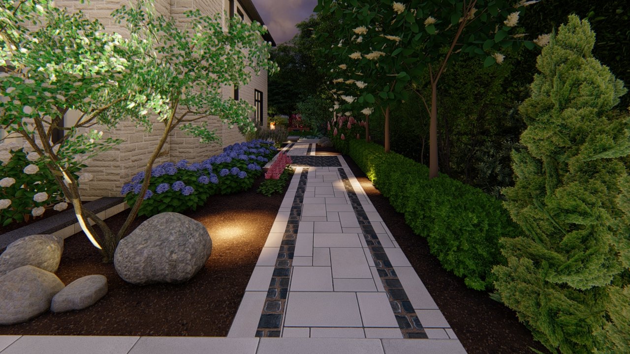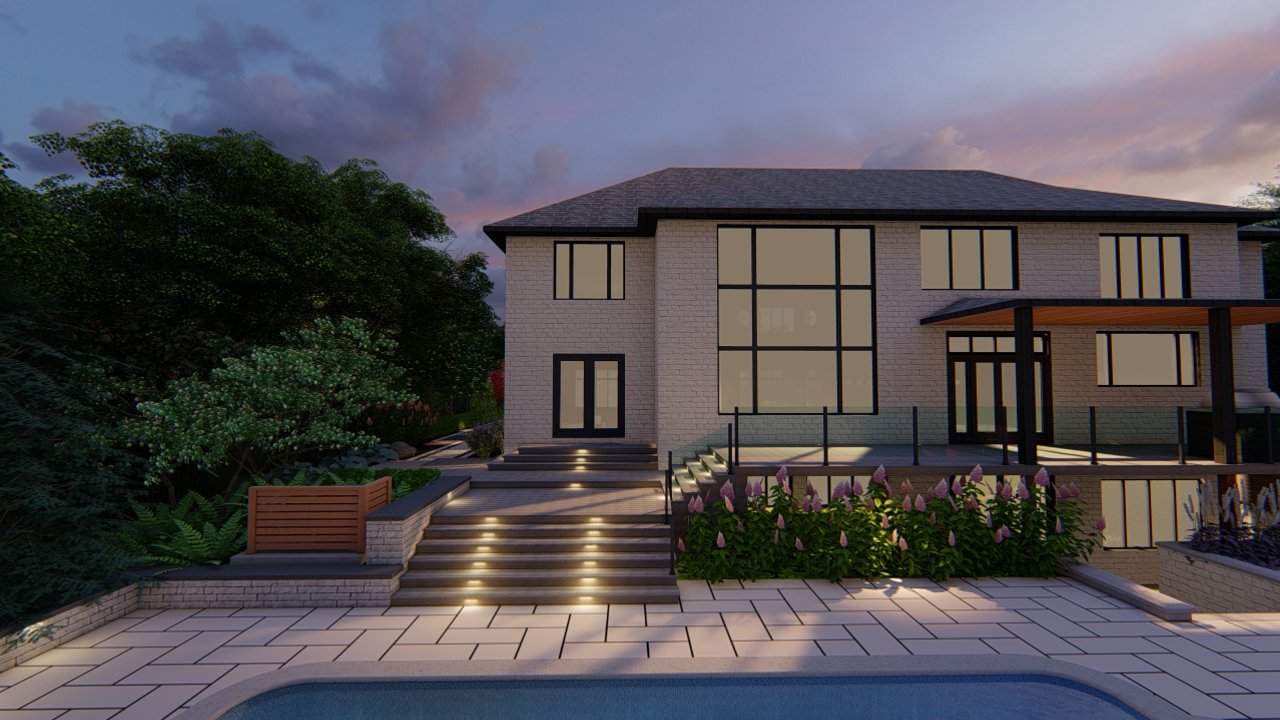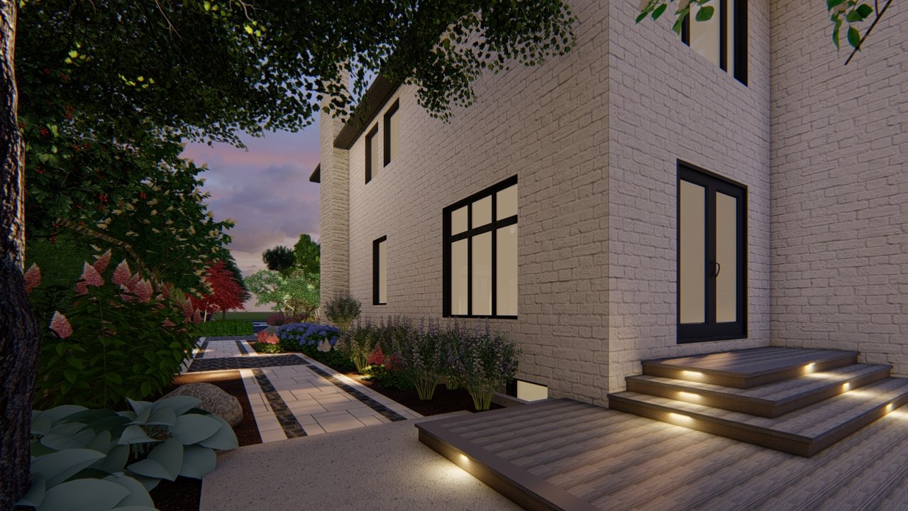 At Leo Landscape Studio, we approach every project as an opportunity to merge artistry with precision. Using Dynascape, SketchUp, and Lumion, we developed an immersive 3D experience that allowed the homeowners to visualize their future property with striking realism — from the subtle texture of stone finishes to the warm evening lighting that framed the pathways.