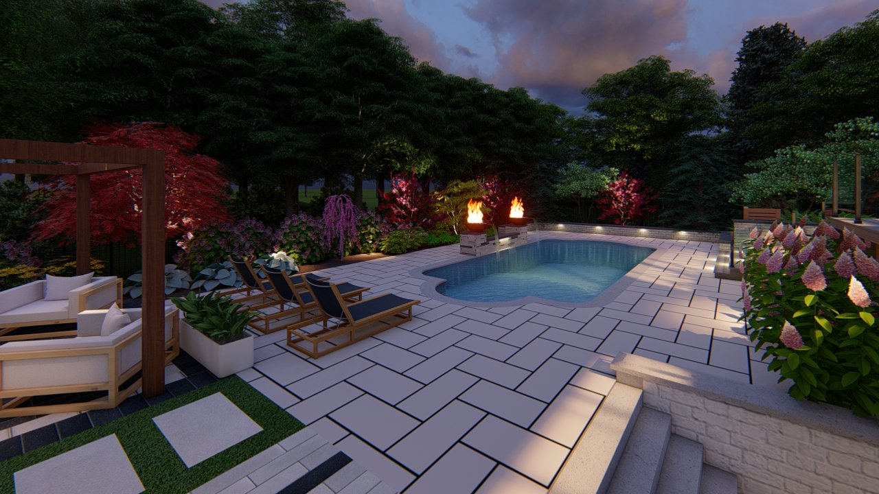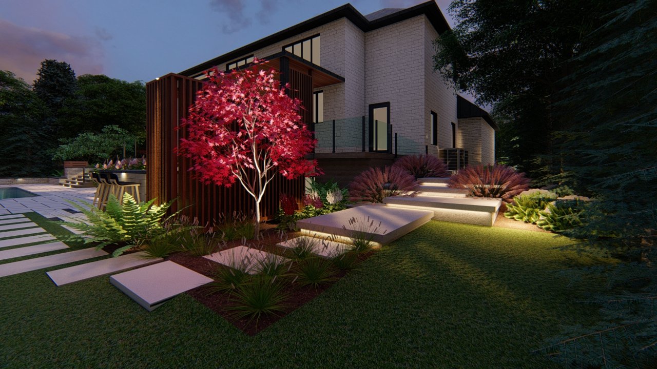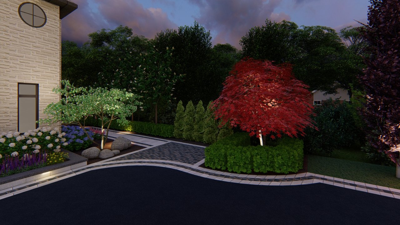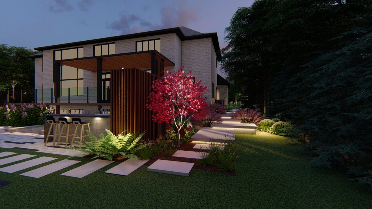 At Leo Landscape Studio, we approach every project as an opportunity to merge artistry with precision. Using Dynascape, SketchUp, and Lumion, we developed an immersive 3D experience that allowed the homeowners to visualize their future property with striking realism — from the subtle texture of stone finishes to the warm evening lighting that framed the pathways.
