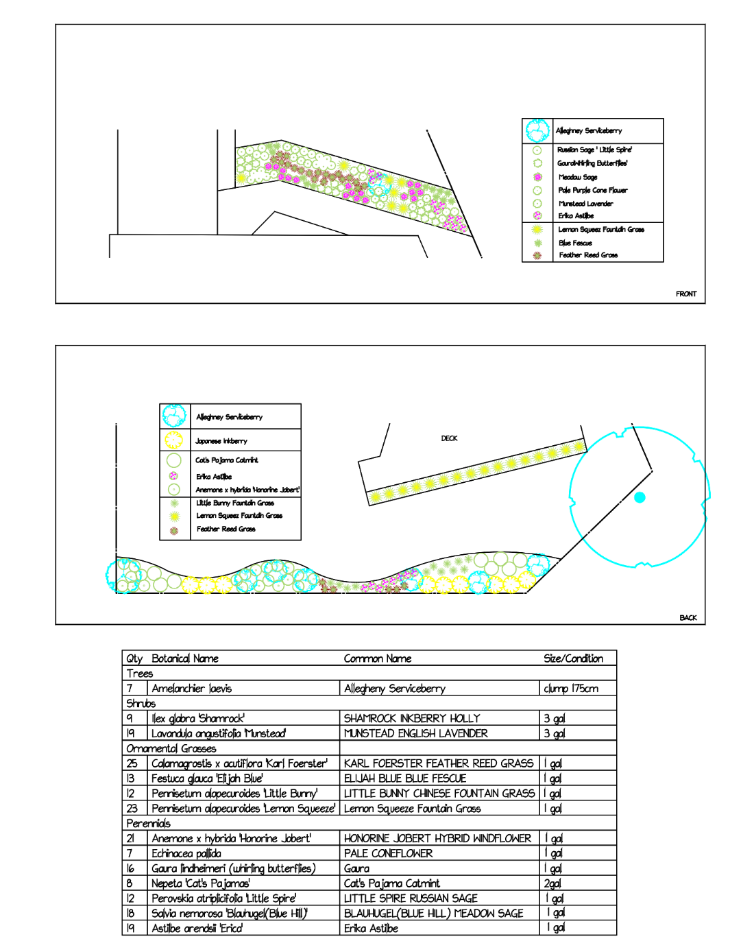 Instead of relying on the typical suburban planting palette, we introduced a contemporary plant composition that combined texture, color, and scale in a rhythmic arrangement. Each species was carefully selected for its seasonal character — from the upright form of Feather Reed Grass to the cloud-like movement of Fountain Grass and the long-lasting blooms of Lavender, Astilbe, and Russian Sage.